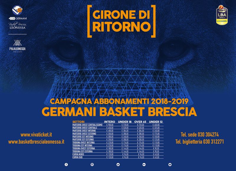 Vieni a seguire la Germani Basket Brescia, c’è tutto il girone di ritorno per continuare a sostenere la squadra! È attiva, infatti, la campagna abbonamenti che permetterà ai tifosi della Leonessa di seguire 7 gare casalinghe del girone di ritorno della regular season della Serie A di basket 2018-2019, nelle quali la Leonessa affronterà i seguenti avversari: Varese (20 gennaio), Trieste (3 febbraio), Trento (10 marzo), Brindisi (17 marzo), Pistoia (31 marzo), Cremona (14 aprile) e Bologna (5 maggio). Le date delle gare sopraindicate potrebbero subire variazioni per esigenze televisive.
