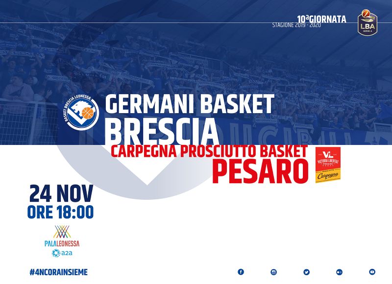 Basket Brescia Leonessa comunica che è attiva la prevendita dei biglietti per la partita tra Germani Basket Brescia e Carpegna Prosciutto Pesaro, in programma domenica 24 novembre alle ore 18.00.