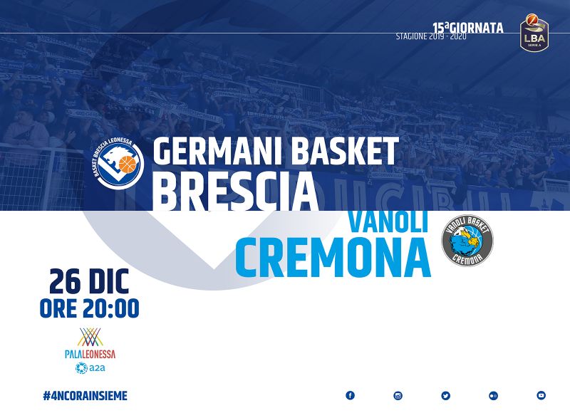 Basket Brescia Leonessa comunica che è attiva la prevendita dei biglietti per la partita tra Germani Basket Brescia e Vanoli Cremona, in programma giovedì 26 dicembre alle ore 20.00.