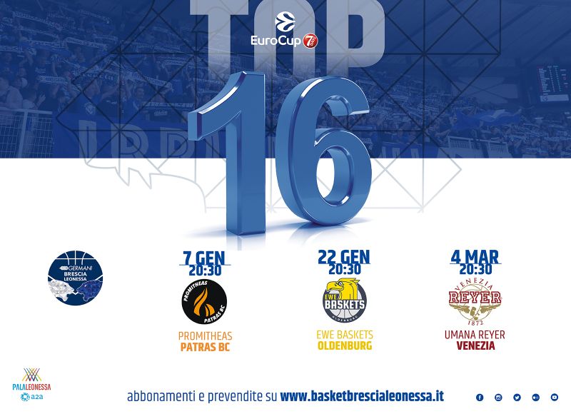 Chiudendo il proprio girone di qualificazione al secondo posto, la Germani Brescia Leonessa ha acquisito il diritto di disputare le Top 16, la seconda fase della 7DAYS EuroCup. Inserita nel Gruppo F con Umana Reyer Venezia, EWE Baskets Oldenburg e Promitheas Patras BC, Brescia disputerà sei partite, tre in casa e tre in trasferta. Al termine delle gare del girone, le prime due classificate acquisiranno il diritto di disputare i quarti di finale della competizione europea.