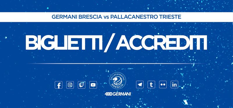 Pallacanestro Brescia comunica che è ancora attiva la prevendita dei biglietti per la partita tra GERMANI BRESCIA e PALLACANESTRO TRIESTE, in programma DOMENICA 12 MARZO ALLE ORE 17.30.