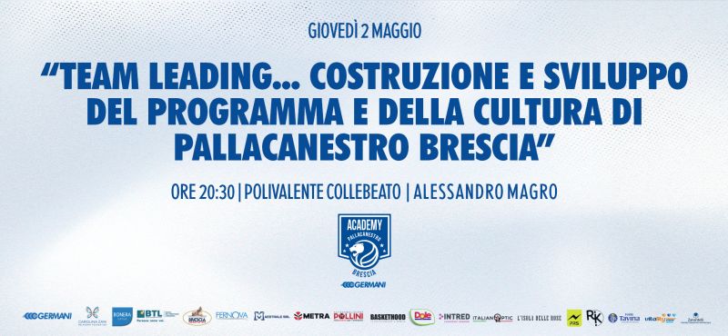 Come di consueto, la riunione tecnica si terrà al Polivalente Collebeato alle ore 20.30. L’ottavo appuntamento sarà giovedì 2 maggio con il capo allenatore della Germani Brescia, Alessandro Magro. L’incontro con i tecnici si focalizzerà sul tema su cui verte la tavola rotonda “Team leading…costruzione e sviluppo del programma e della cultura di Pallacanestro Brescia”. A seguire, sarà previsto un momento di confronto con i presenti attraverso la modalità di domanda e risposta.