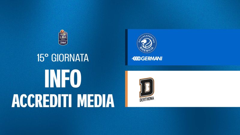 Pallacanestro Brescia comunica che le richieste di accredito da parte di giornalisti, operatori della comunicazione e fotografi per la 15° giornata del campionato di Lega Basket Serie A, tra Germani Brescia e Bertram Derthona Tortona, in programma domenica 11 gennaio alle ore 19:00 presso il PalaLeonessa A2A, dovranno essere inoltrate mediante il form presente nella press area (link), a partire dalle ore 12:00 di lunedì 5 gennaio, e fino al termine ultimo delle ore 12:00 di mercoledì 7 gennaio.