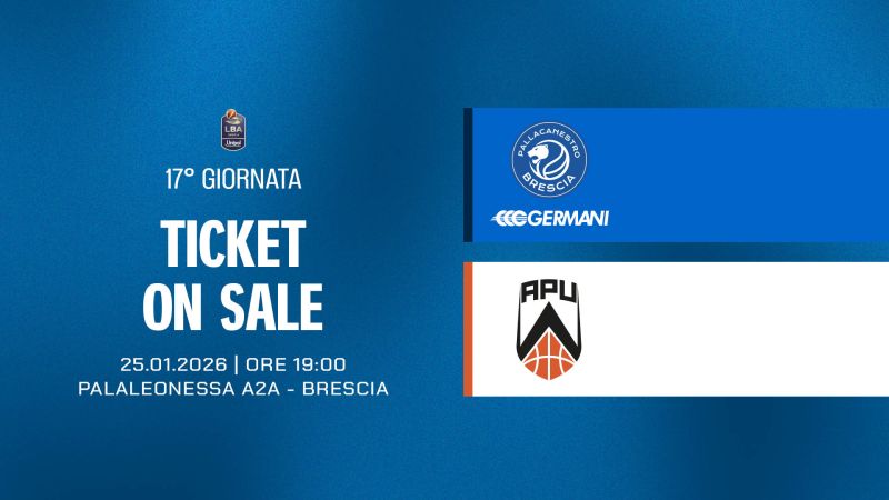 Pallacanestro Brescia comunica che, a partire dalle ore 09:00 della giornata odierna, mercoledì 14 gennaio, è attiva la prevendita dei biglietti per la partita tra Germani Brescia e APU Old Wild West in programma domenica 25 gennaio alle ore 19:00 presso il PalaLeonessa A2A.